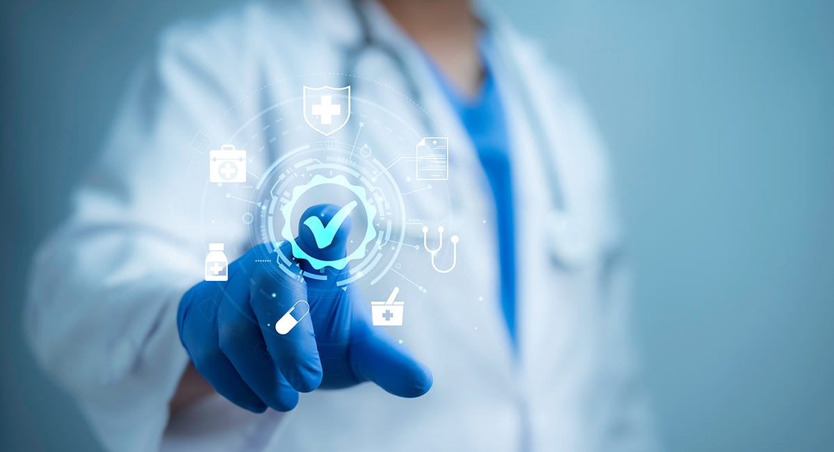 Person im Arztkittel mit blauen Handschuhen tippt auf ein schwebendes Häkchen-Symbol, umgeben von medizinischen Icons.