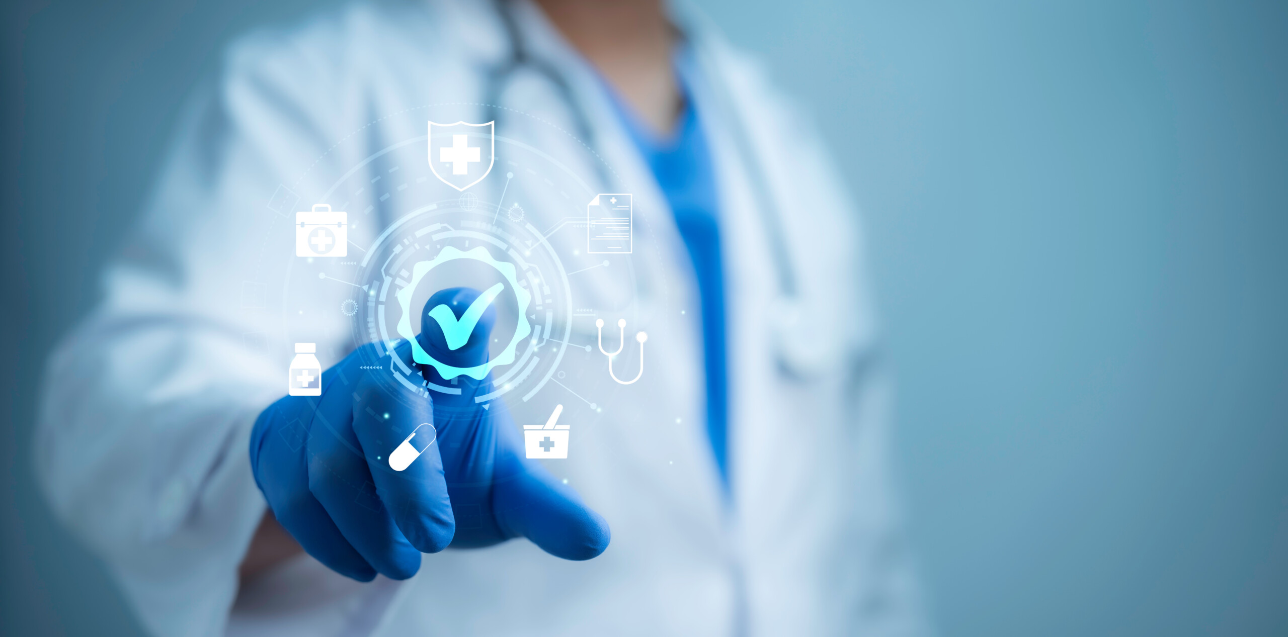 Person im Arztkittel mit blauen Handschuhen tippt auf ein schwebendes Häkchen-Symbol, umgeben von medizinischen Icons.