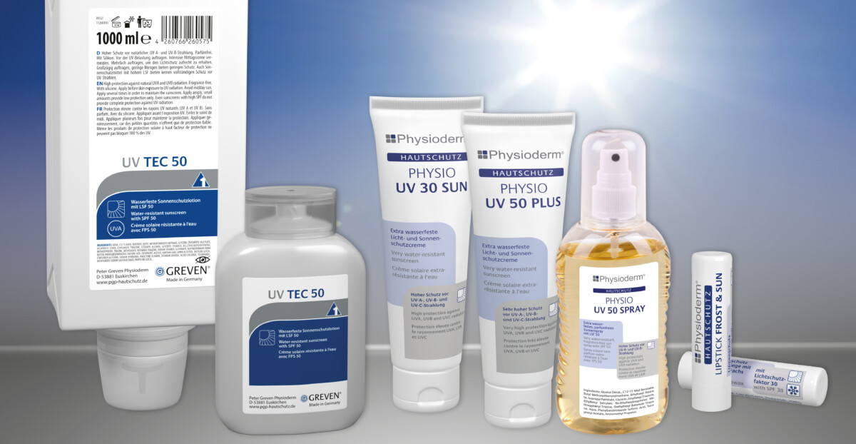 PGP führt das umfangreichste UV-Schutzprogramm der Branche und bietet für sämtliche Einsatzgebiete die richtige Lösung. Die parfüm- und duftstofffreie Sonnenschutzcreme „Physio UV 50 PLUS“ etwa bietet sehr hohen Sonnenschutz auch unter extremen Bedingungen wie Nässe und Hitze. Sie ist extra wasserfest und muss somit nicht gleich wieder neu aufgetragen werden, wenn der Anwender schwitzt. Eine Alternative dazu ist die „Lotion Greven UV TEC 50“. Die wasserfeste Hautschutzlotion hat einen Lichtschutzfaktor 50, ist parfümfrei und dadurch besonders hautverträglich. Sie zieht sehr schnell ein und überzeugt mit einem sehr guten Preis-Leistungs-Verhältnis. Für alle, die Sprays bevorzugen, ist das extra wasserfeste und parfümfreie „Physio UV 50 Spray“ die richtige Wahl.