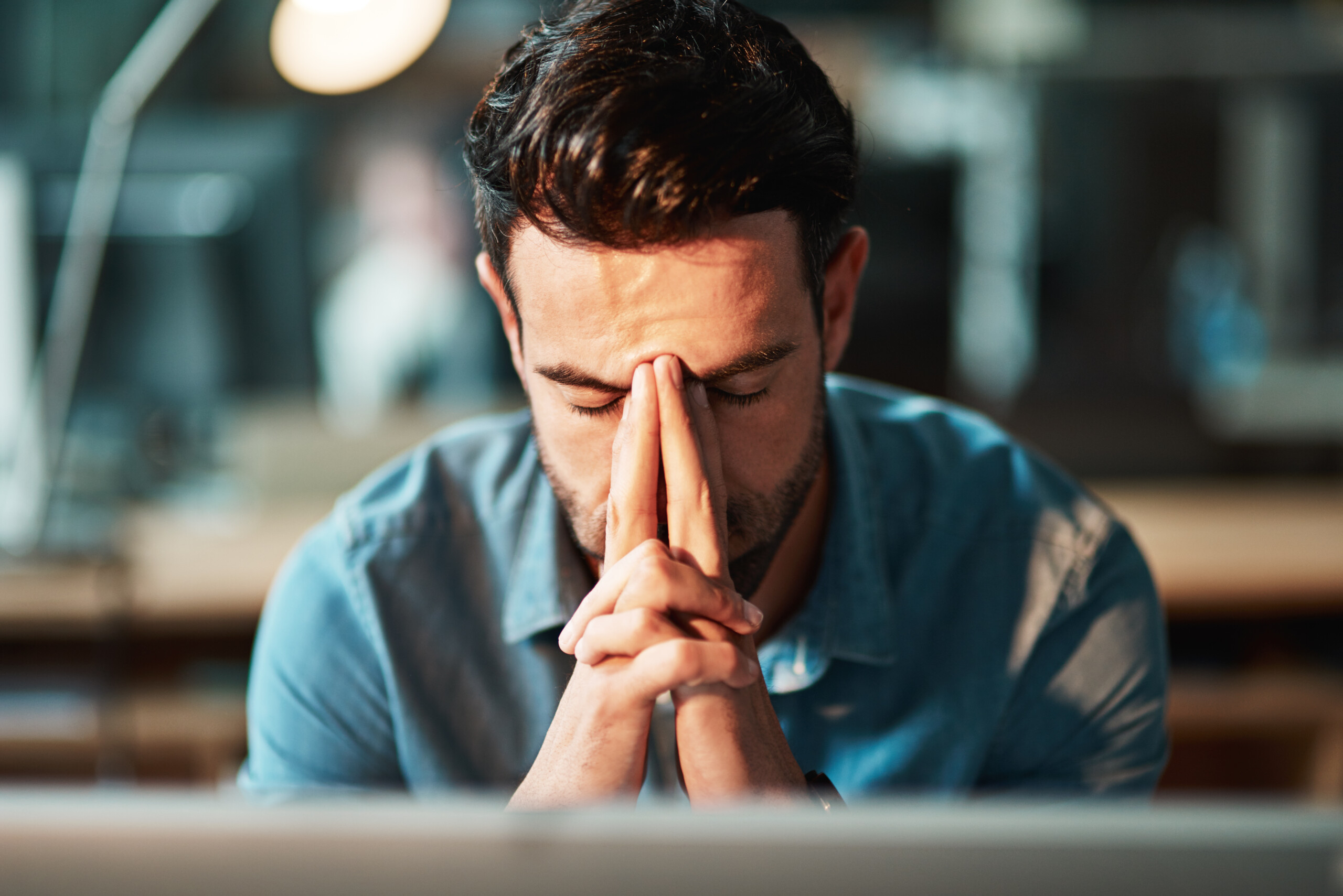 Mann presst die Hände nachdenklich ans Gesicht und wirkt erschöpft oder gestresst.