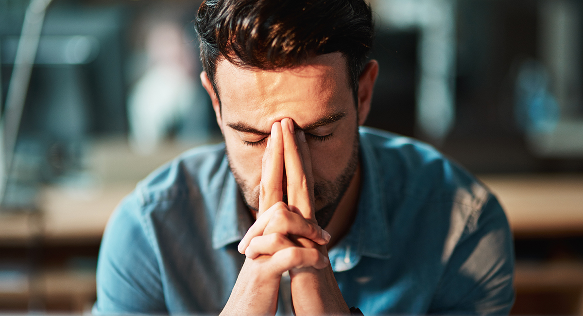 Mann presst die Hände nachdenklich ans Gesicht und wirkt erschöpft oder gestresst.