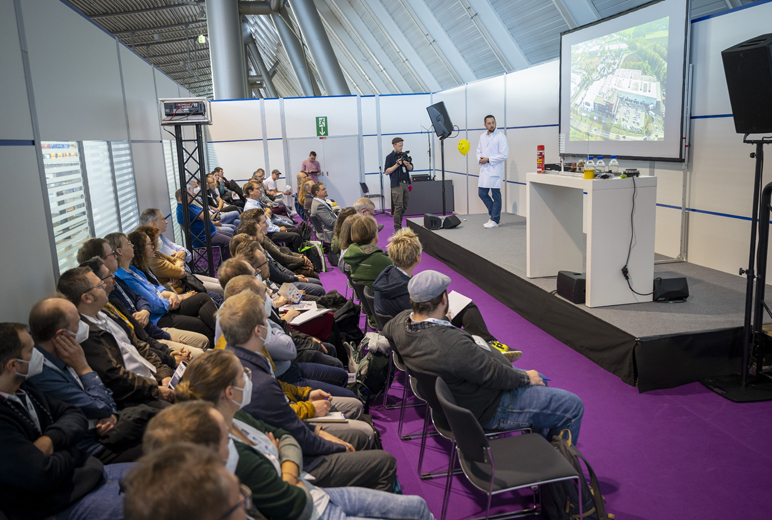 Ein Mann in weißem Kittel steht auf einer Bühne und hält einen Vortrag vor einem Publikum.