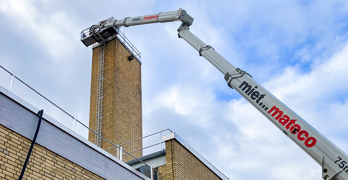 Für die sichere Installation nutzen die Spezialisten der Munk Service am Schornstein eine Arbeitsbühne.