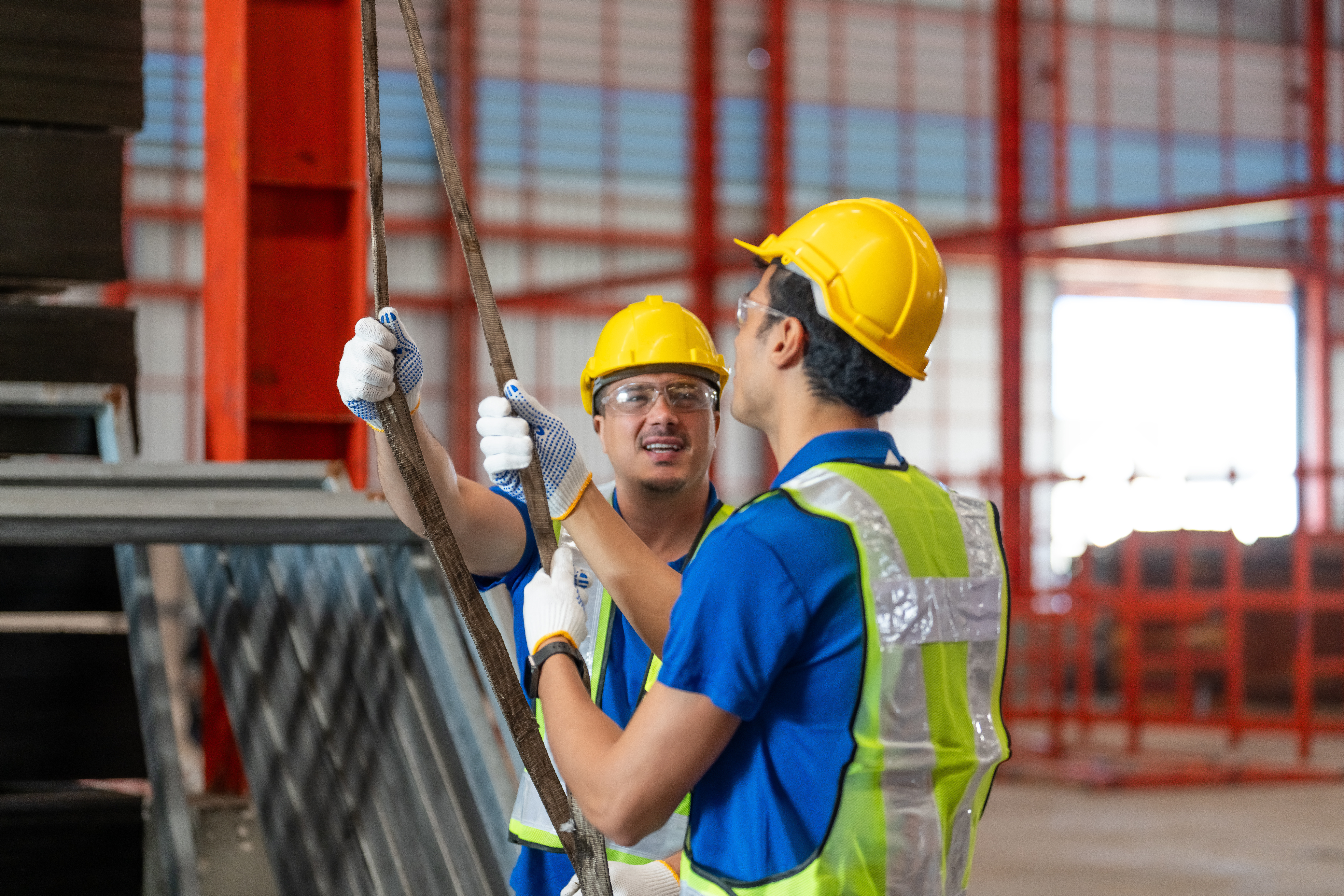 Zwei Bauarbeiter tragen Sicherheitshelme und Schutzwesten. Beide halten ein Seil und unterhalten sich. Die Szene findet auf einer Baustelle statt.